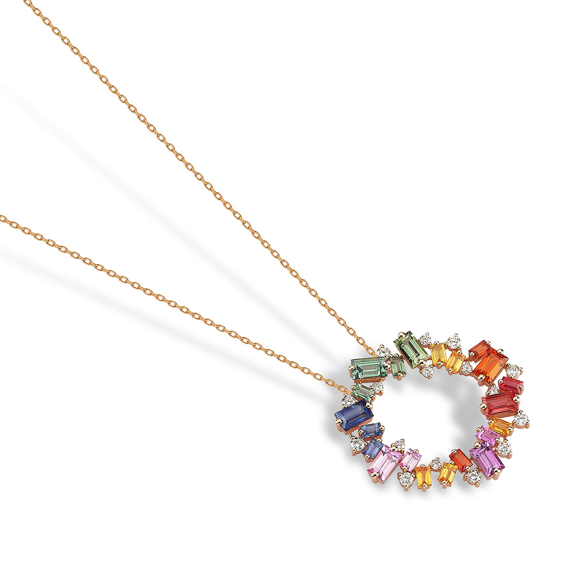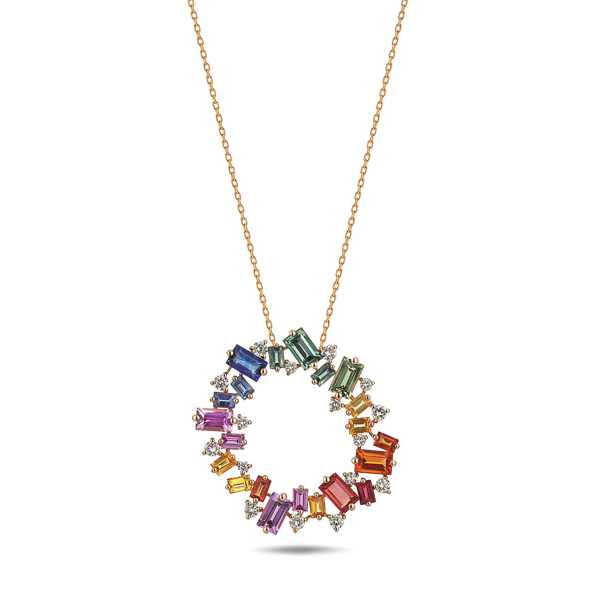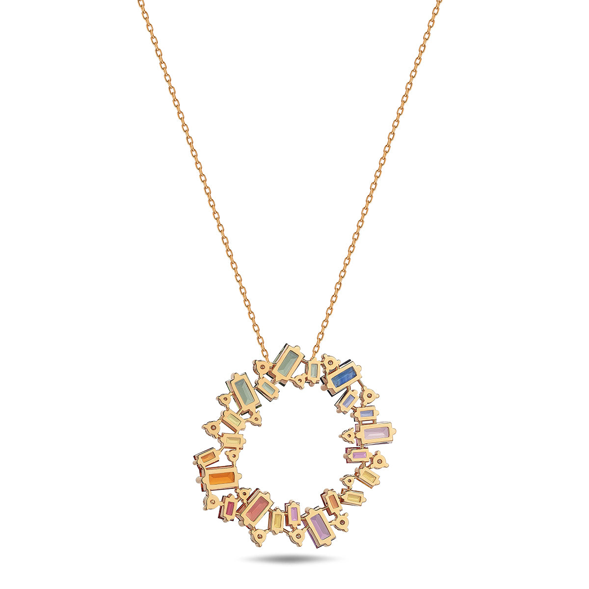 Çeşitli renklerdeki taşlar, ışığın her tonunu yansıtarak çevresindeki altın çerçeveyle bir araya gelir ve zarif bir çember yaratır.
