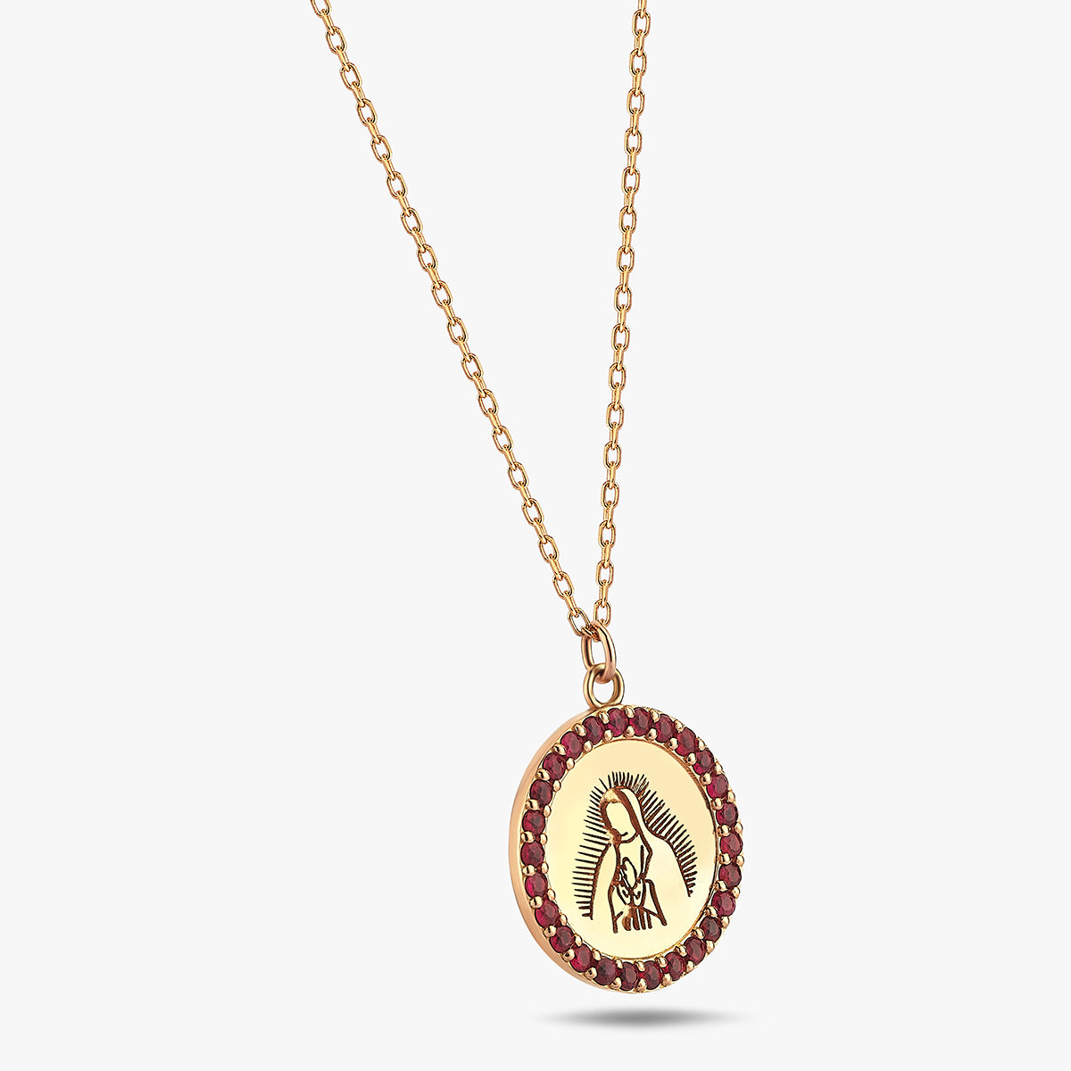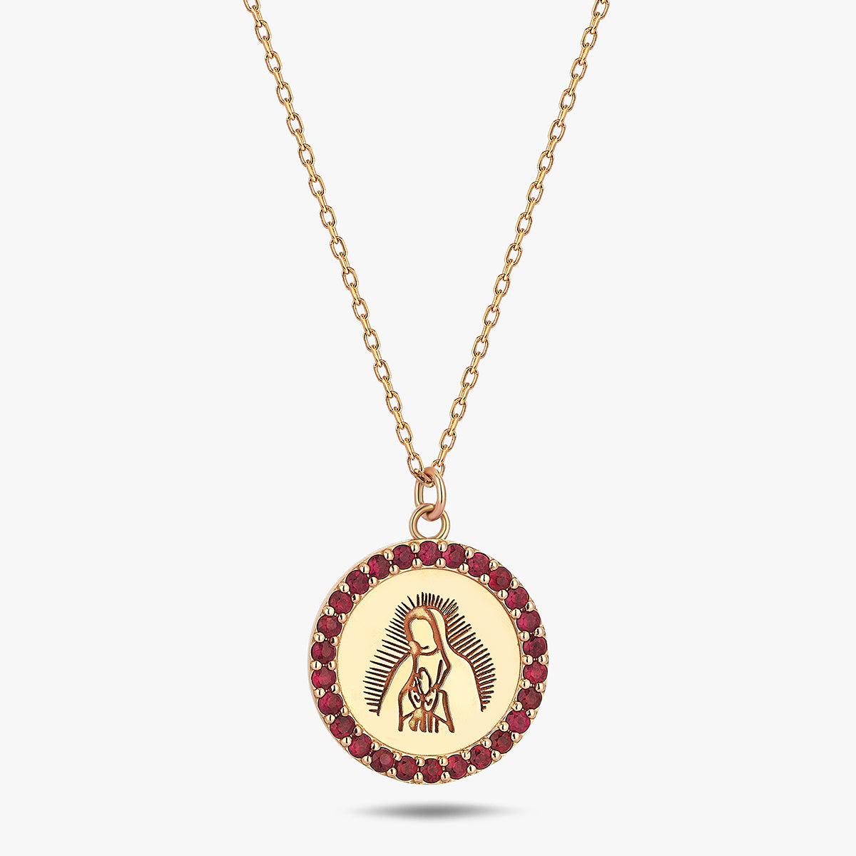 18 ayar altından tasarlanan Divine Grace kolye, zarif Meryem Ana figürü ve çevresini saran yakut taşlarının göz kamaştıran ışıltısıyla anlam ve şıklığı bir araya getiriyor. Kutsal zarafetin simgesi olan bu özel tasarım, stilinize hem değer hem de ruh katıyor.